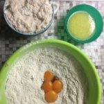 - Egy nagyobb tálba szitálva teszed a liszteket, sót. (ha édesen szeretnéd, akkor a plusz cukor illetve a citromhéj is itt kerül a tálba). Mélyedést készítesz a közepébe; mehet bele a tojássárgája, a felfutott élesztő, a maradék langyos tej.